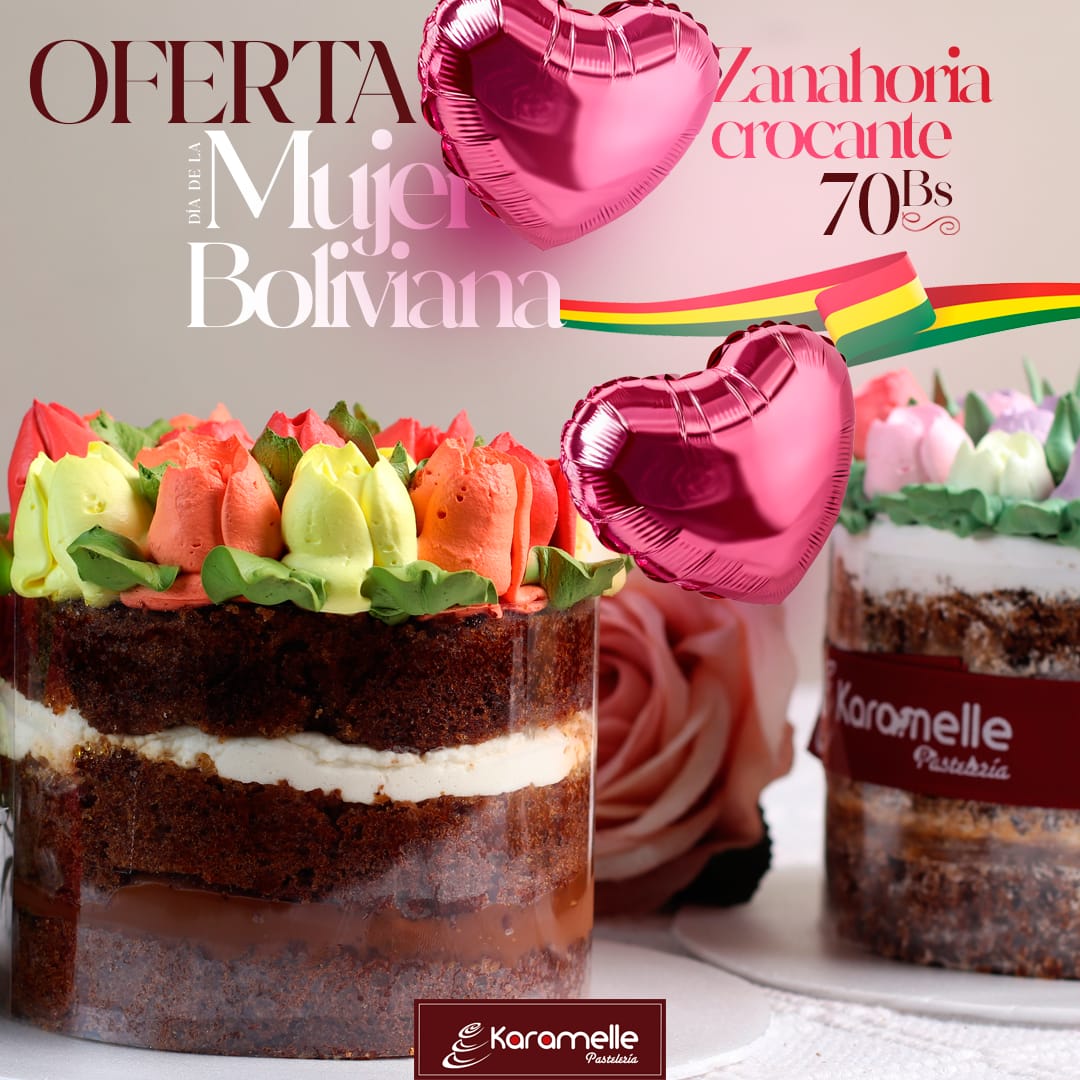 Del 08 al 12 de Octubre, festejamos a nuestras valerosas Mujeres Bolivianas con un nuevo sabor de Torta, nuestra deliciosa Zanahoria Crocante en tan solo 70 Bs. 🎉