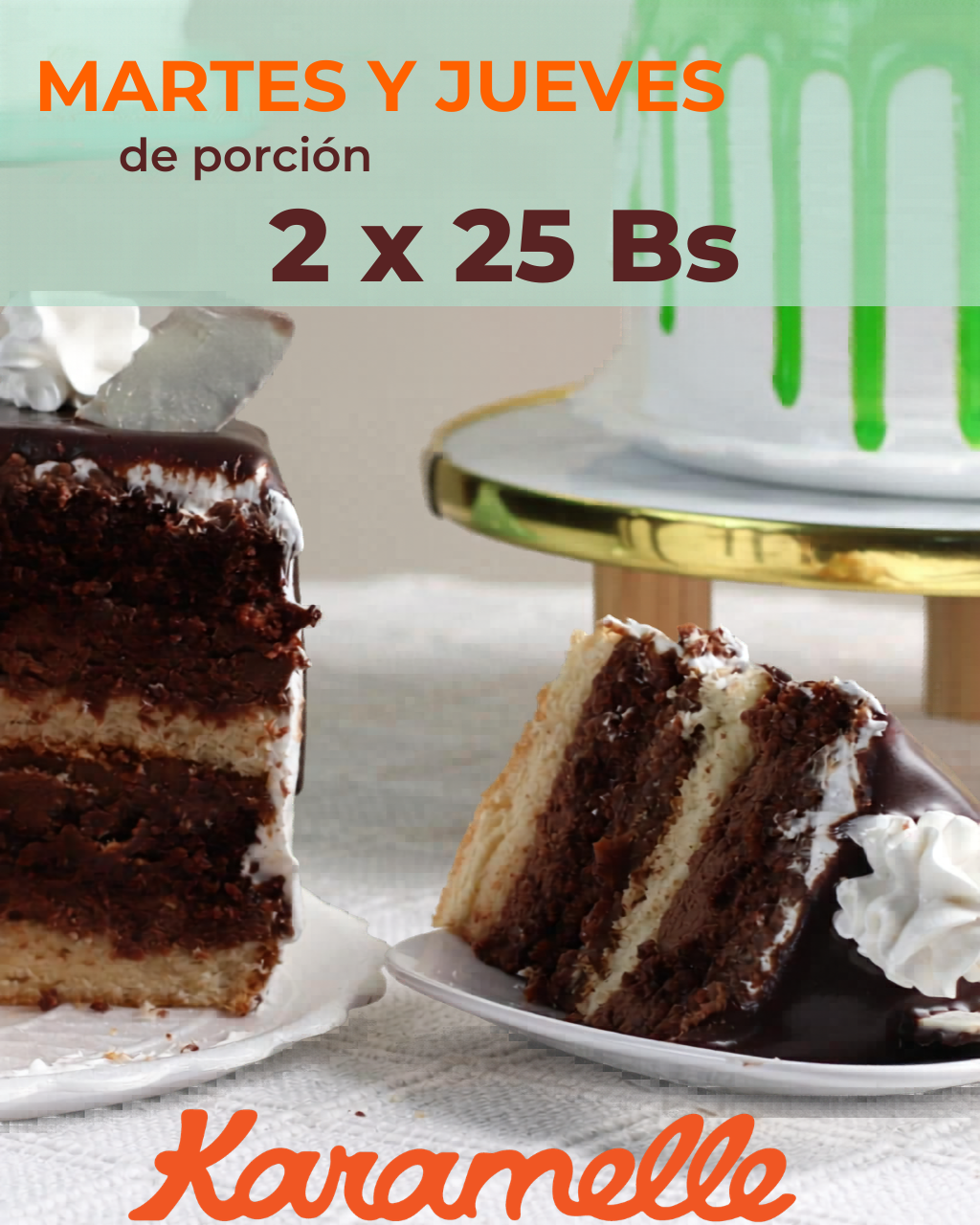 🎉¡TODOS los MARTES Y JUEVES tenemos promoción en Porciones 2 x 25 bs.!! 🎉🍰